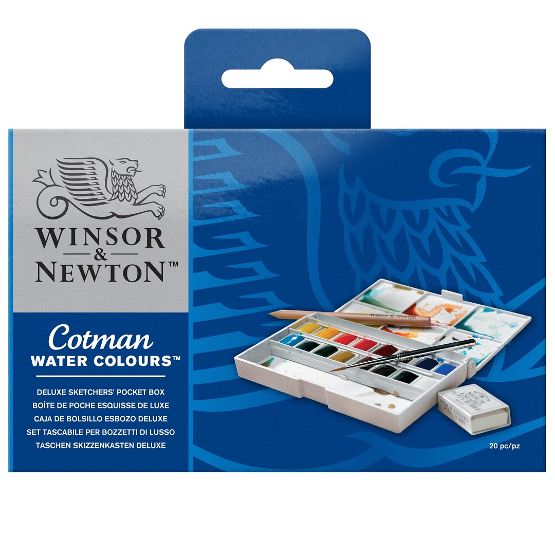 Las acuarelas Cotman se caracterizan por ser de alta calidad y proporcionan transparencia, excelente poder colorante y unas condiciones de trabajo óptimas. Las pastillas están fabricadas a partir de pigmentos selectos. Contenido: 1 caja de plástico con paleta integrada y anillo, 16 acuarelas cotman en pasta, 1 pincel Cotman, 1 borrador miga de pan, 1 lápiz Winsor & Newton.