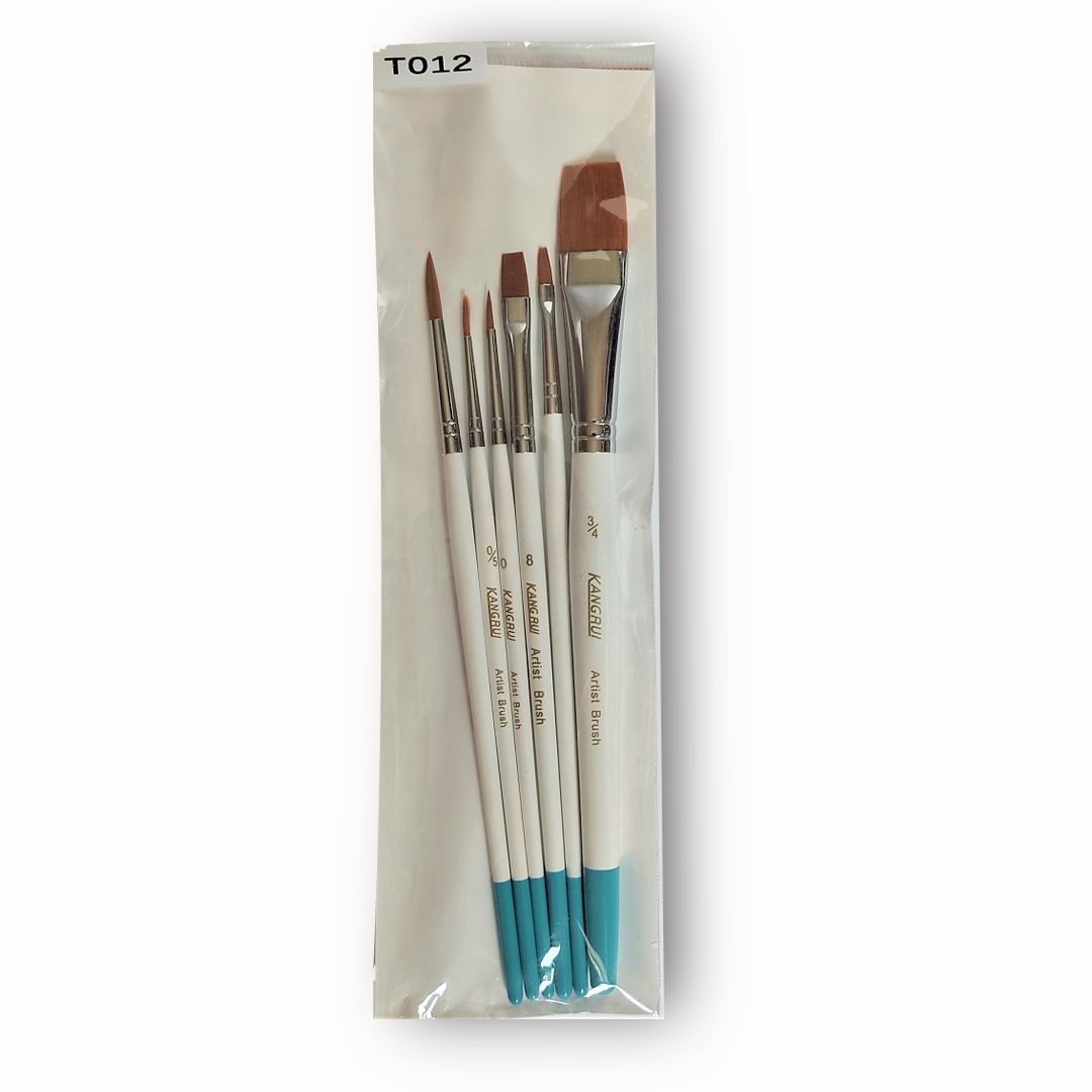 Set de pinceles por 6 unidades, pelos de cerda suave de nylon, contiene 3 pinceles planos números 2, 8, y 3/4 y 3 pinceles redondos números 0, 0/5 y 5.